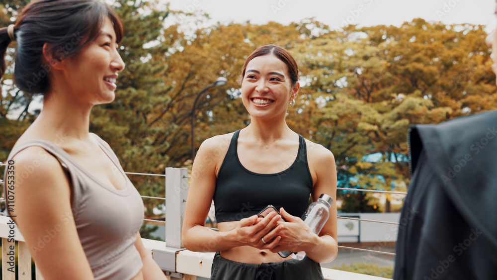 Group, fitness and break for women, exercise and routine in morning, smile and bonding with conversation. Outdoor, workout and Asian people with bottle of water, bridge and wellness for friends