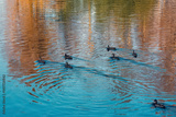 Ducks swim in a pond in an autumn park.