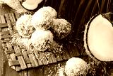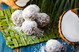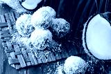 Coconut rum balls on green mat of palm leaves