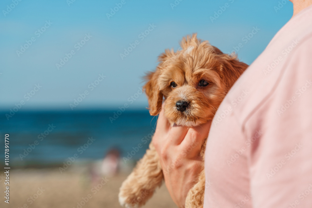 A young man holds a puppy of a Cavapoo or Cockapoo breed dog on the beach by the sea. Close-up of curly brown baby Maltipu.
