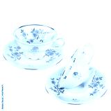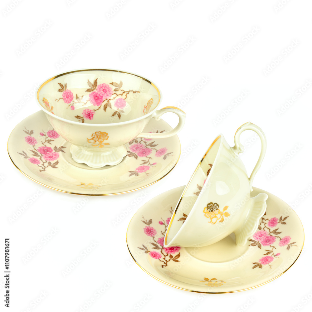 Vintage porcelain cups and saucer isolated on white background. Collage.