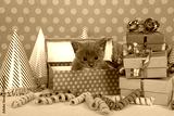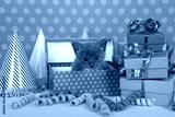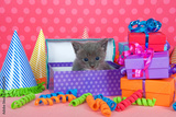 Gray and white kitten in birthday box with presents and party hats