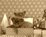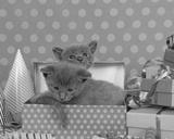 Two one month old kittens in a pile of birthday boxes, party hats, presents