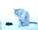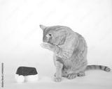 Orange tabby cat sitting next to small santa hat hiding face with paw