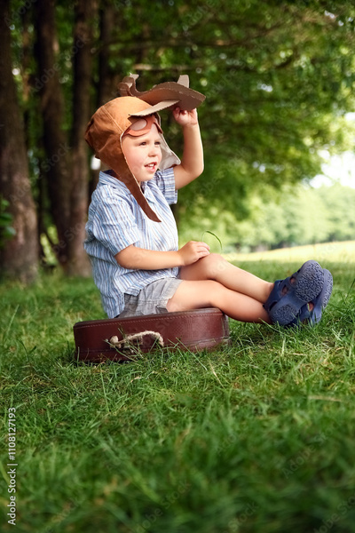 A Baby boy by the plane plays on nature in the park. Boy on vacation pilot.
