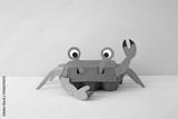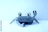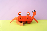 Recycled crab craft using egg carton with paper details for legs, claws, and eyes. Waving claw on purple background with green-yellow surface. Fun eco-friendly DIY idea,