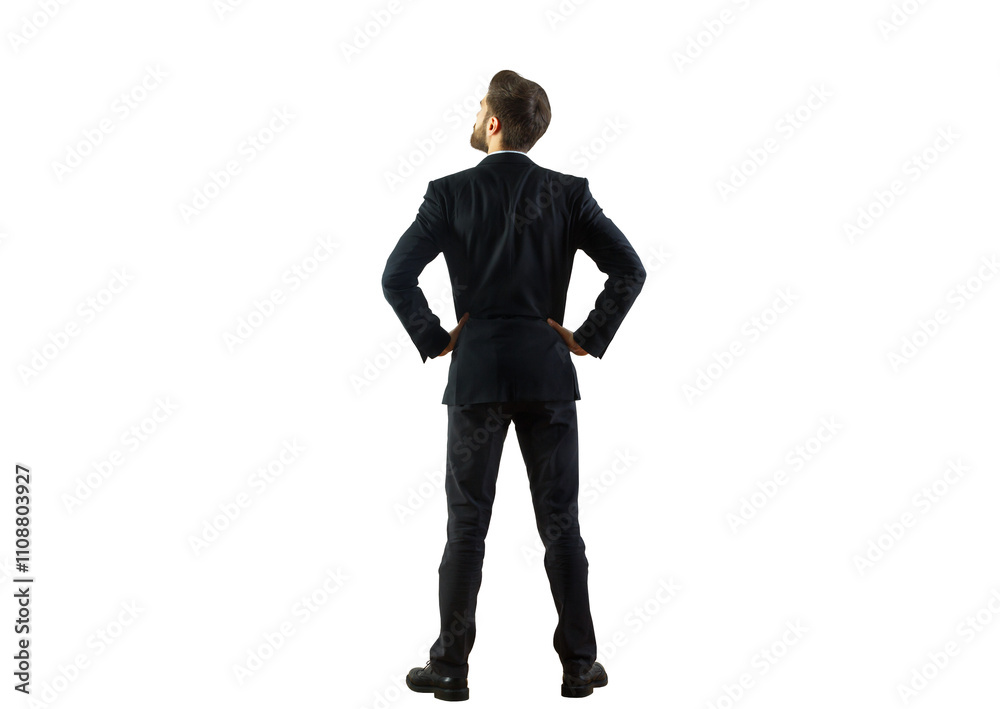 A man in a dark suit viewed from behind, standing with hands on hips, isolated on a clean white background. Concept of confidence, business, and leadership