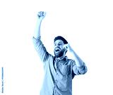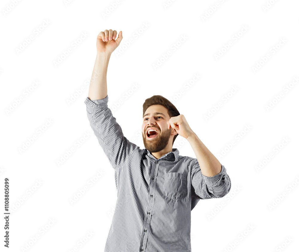Man in checkered shirt smiling and cheering with raised arm, isolated on a white background. Concept of happiness, success, and celebration