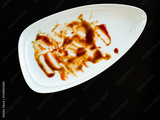Dirty plate top view background, finished eat dinner in restautant, abstract textuer stain smearing drip sauce bbq jam chilli jelly on ceramic breakfast, concept for clean hyginene product.