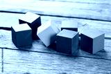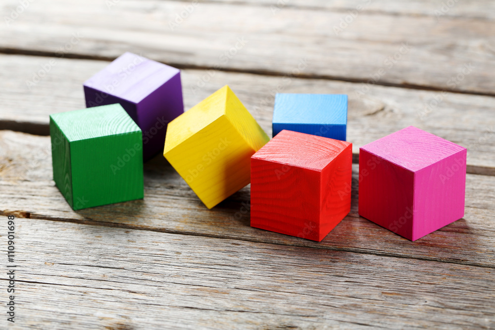 Colorful wooden toy cubes on a grey wooden background