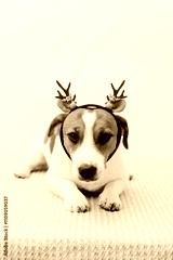 Cute Jack Russell Terrier dog wearing Christmas reindeer antlers, sitting on a white background and looking festive. Happy New Year and Merry Christmas greeting card with pet