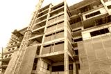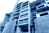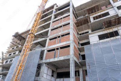A large building under construction with cranes towering above the site, showcasing a busy work environment and extensive machinery. The project shows massive progress.