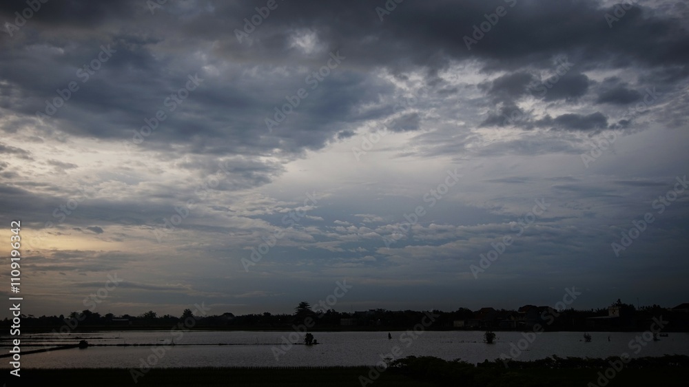 photo of the afternoon sky in the rice fields, with dark clouds