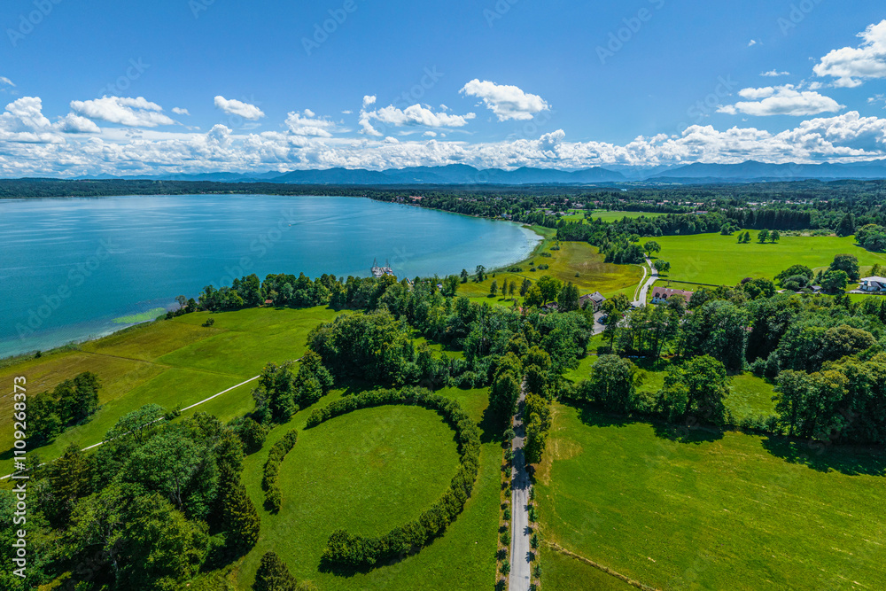 Ausblick auf die bayerische Region Oberland am südwestlichen Starnberger See bei Seeseiten