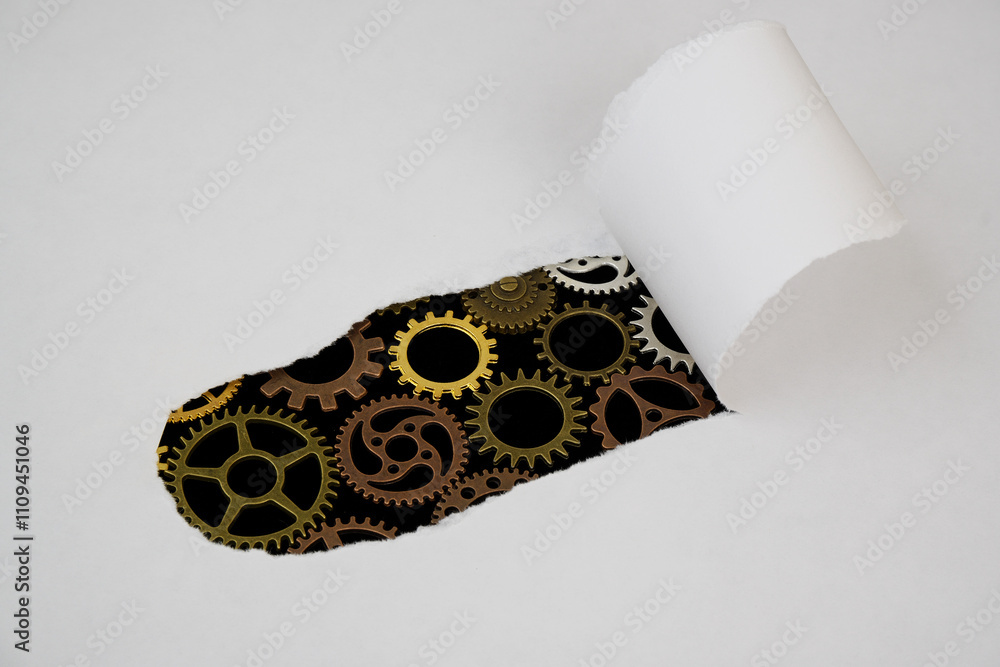 Paper torn shows secret connected metallic gears. Hiding processes concept.