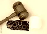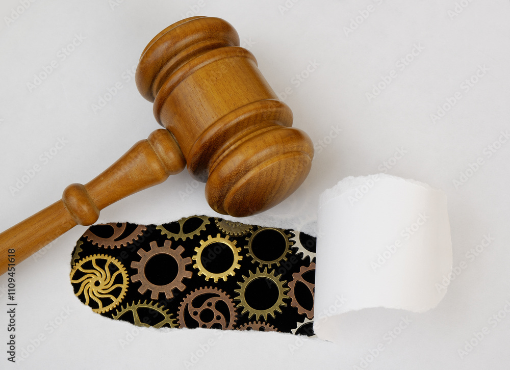 Laws and court processing concept. Wooden gavel on many connected gears under paper torn.