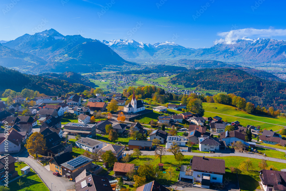 The village of Übersaxen above the Rhine Valley in the State of Vorarlberg, Austria, Drone Photography