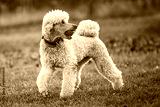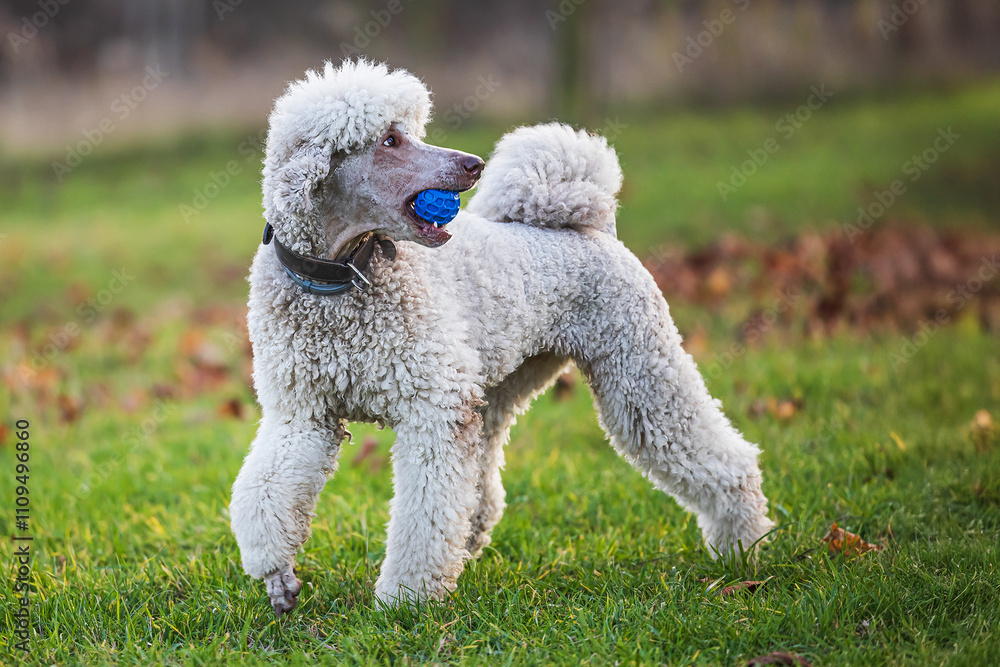 White beautifully Poodle He runs with the ball in his mouth