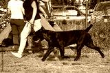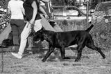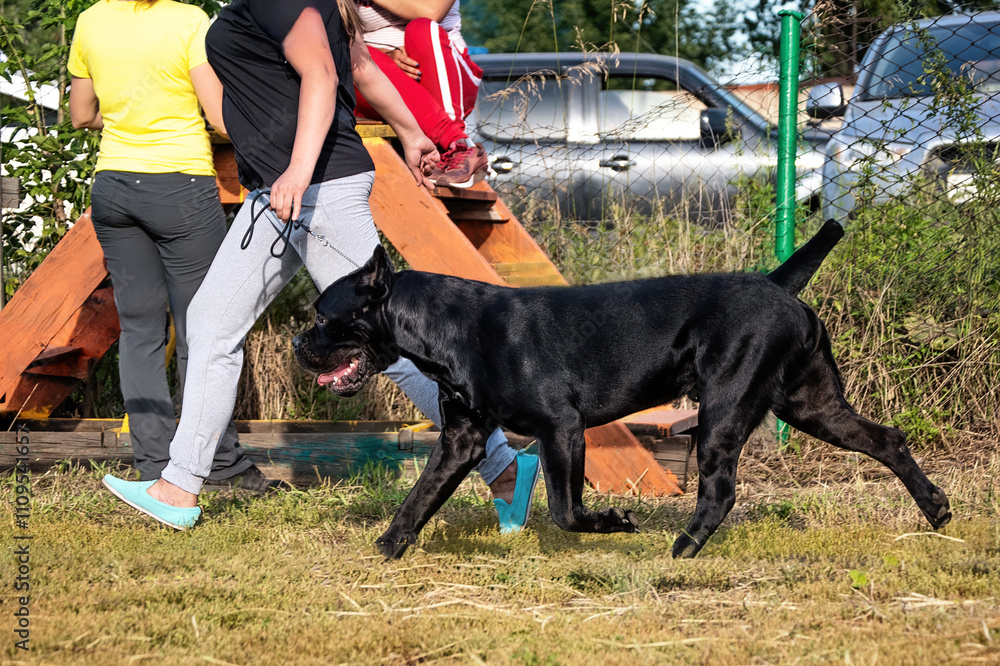 A woman walking with a Italian Cane-Corso dog in summer.