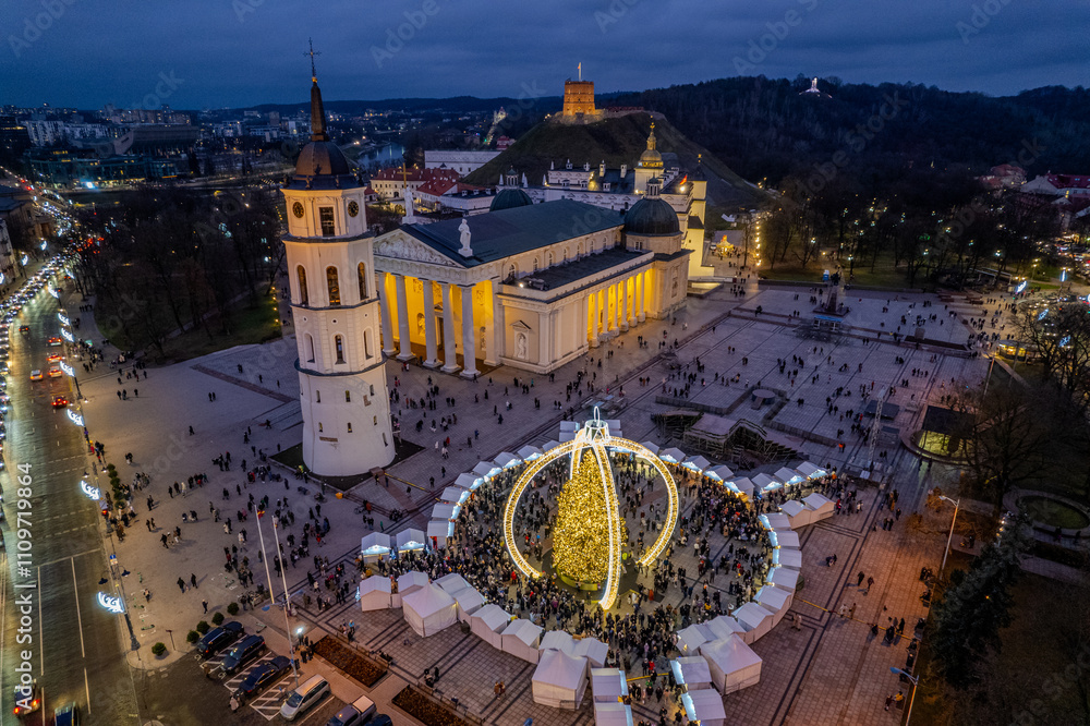 Aerial winter morning sunrise view of Cathedral Square, Vilnius old town, Christmas Tree, Lithuania