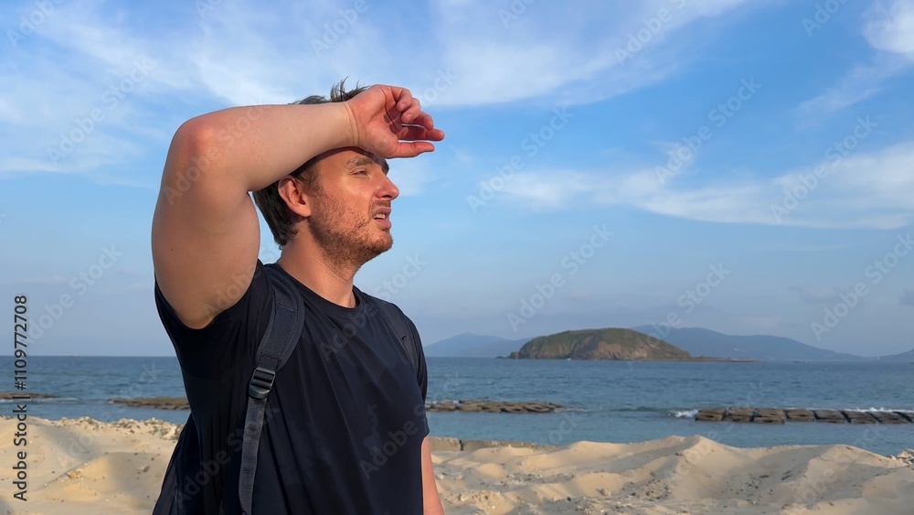 Young man suffering from heat, high temperature, hot weather. Dangerous sun, sunstroke
