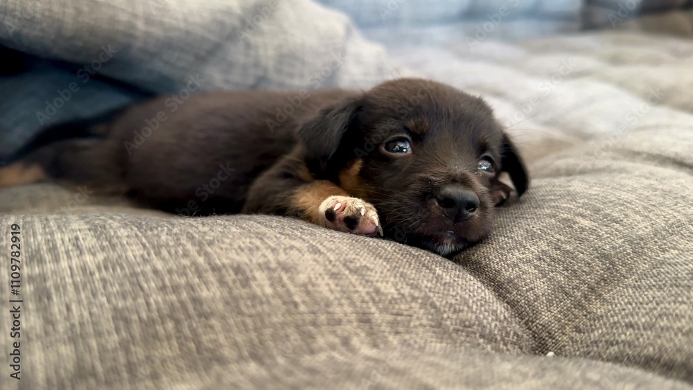 Little cute black puppy lying on the couch and sleep