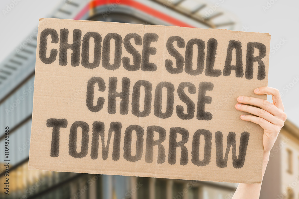 The phrase 'Choose solar, choose tomorrow' on a banner, renewable energy, sustainable choices. Renewable. Energy. Future. Clean. Solar. Sustainability. Tomorrow.