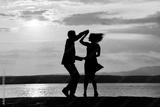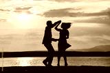 Couple silhouette dancing by the sea at sunset