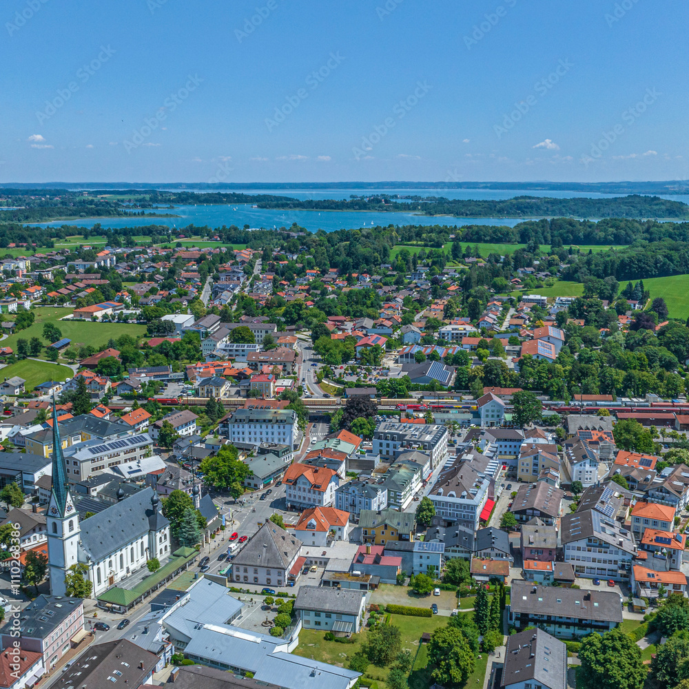 Ausblick auf den Kurort Prien am westlichen Chiemsee-Ufer im Chiemgau im Sommer