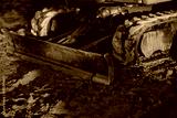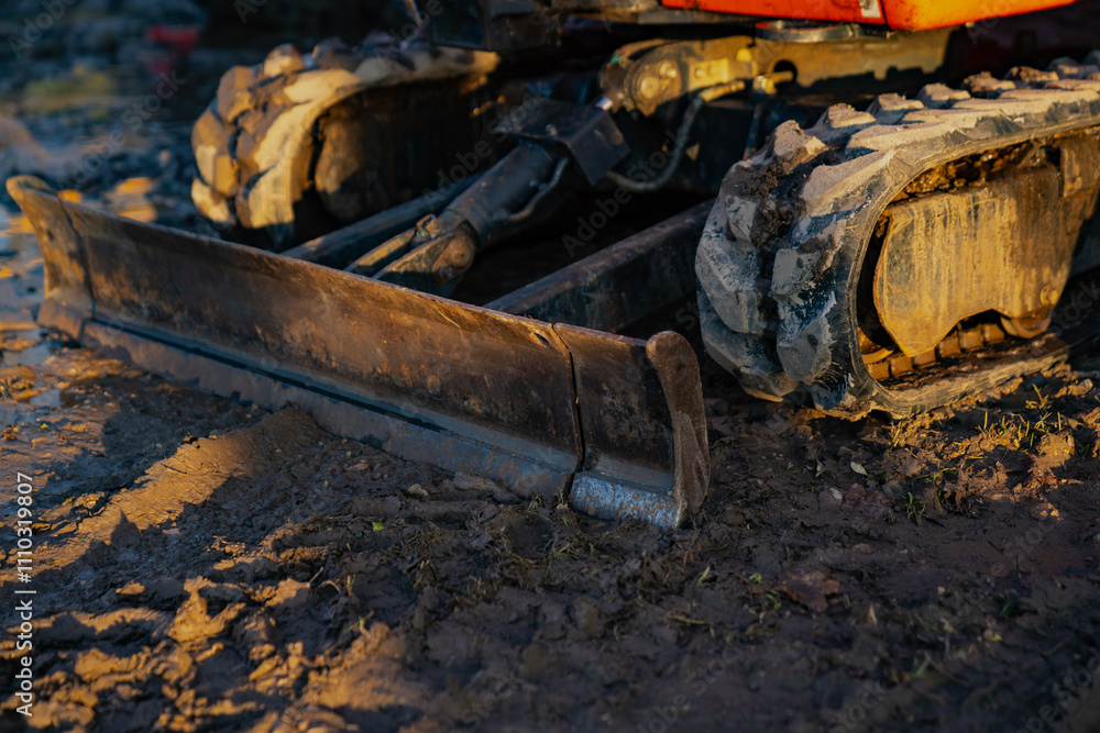 Industrial construction machinery rubber tracks dirty with mud and wet dirt close up of excavator blade