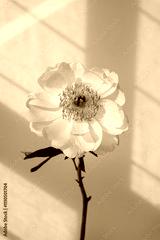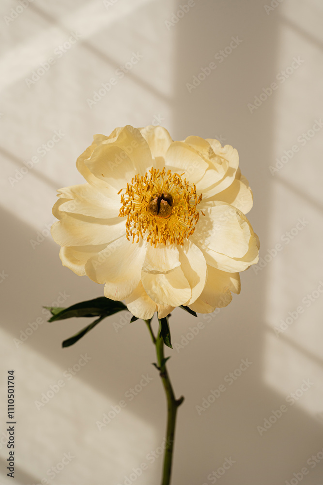 Sunlit Yellow Flower Casting Shadows on White Wall. Natural Beauty and Serenity with Soft Lighting and Delicate Petals
