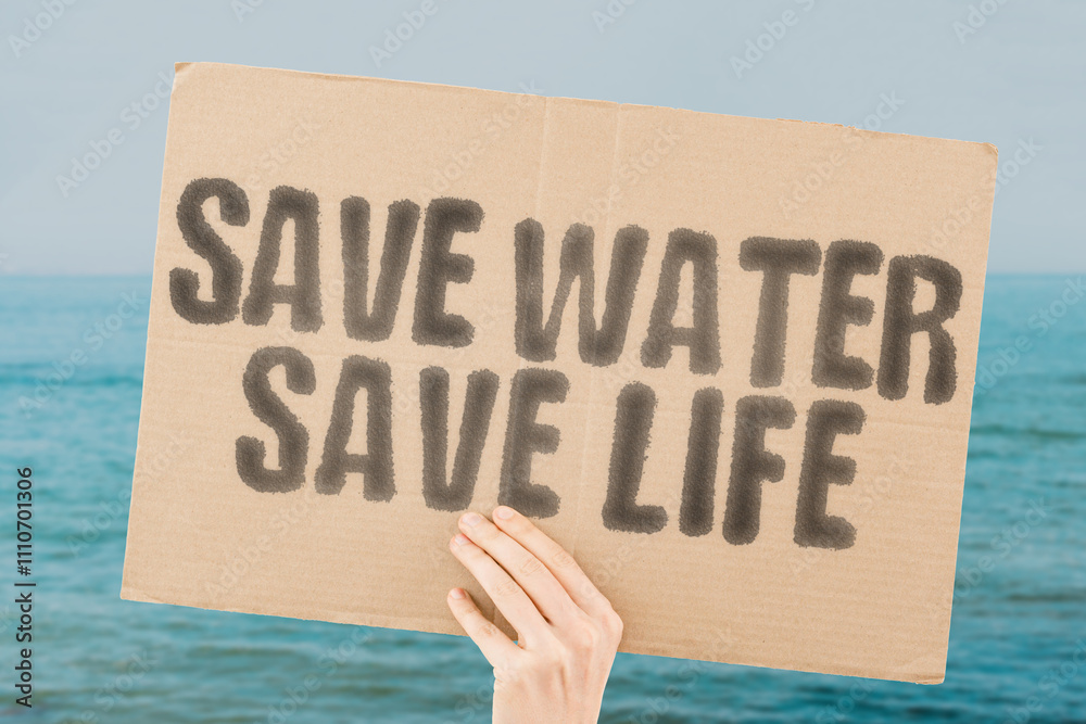 A cardboard banner reads 'Save water, save life,' emphasizing conservation and sustainability. Conservation. Water. Sustainability. Life. Eco. Resource. Vitality