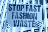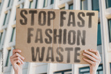 A cardboard banner reads 'Stop fast fashion waste,' advocating for sustainable choices and reducing pollution. Sustainability. Textiles. Pollution. Eco. Waste. Change. Ethical