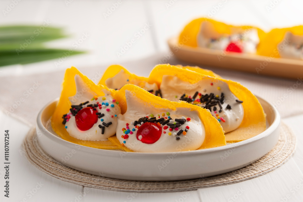 Thai crepes ,Thai Crispy Pancake topped with sweet cream fillings jelly and rainbow sprinkles topping(Kanom Buang).popular thai street food.