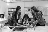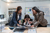 Two angry businesswomen are scolding a stressed employee about bad results, pointing at documents and charts on the table during an office meeting