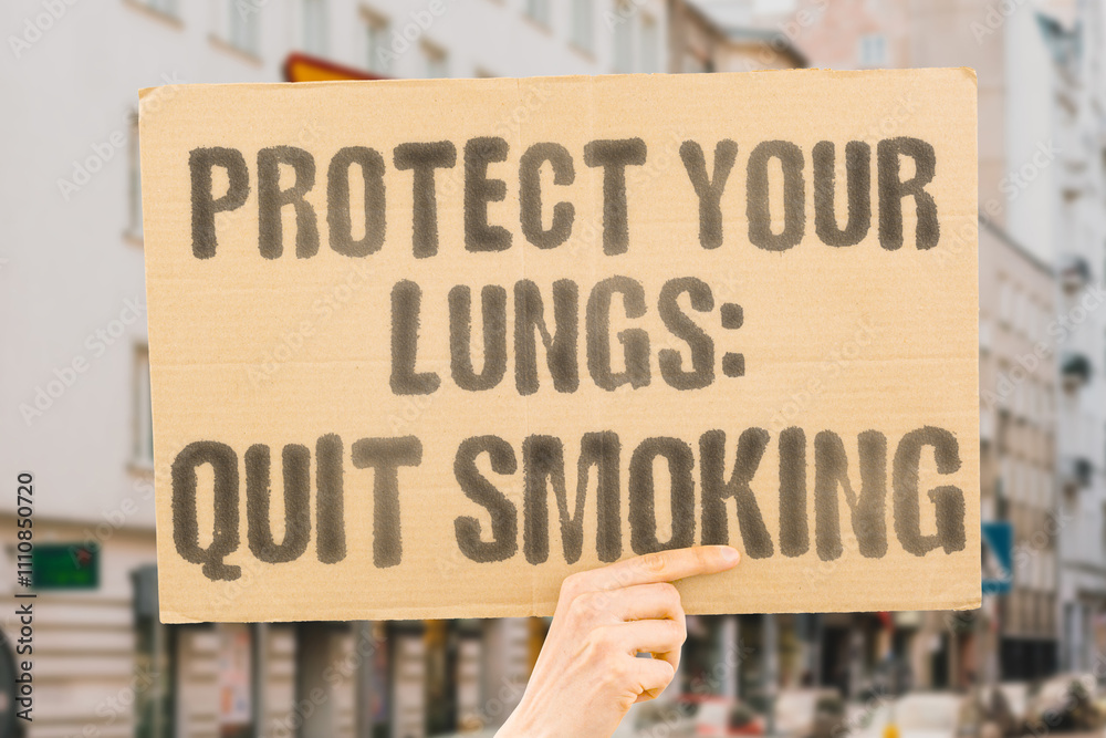 Banner reading 'Protect your lungs: Quit smoking' encourages a healthier lifestyle. Health. Quit. Smoke-free. Cigarettes. Breathing. Clean air. Wellness