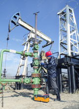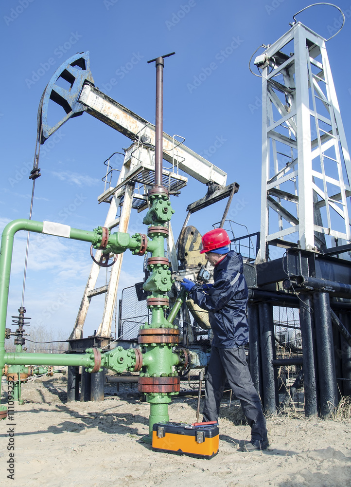 Worker reparing wellhead with the wrench in the oilfield. Tool box foreground, pumpjack background. Oil and gas concept.