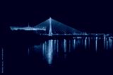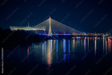 Beautiful panoramic night aerial view from drone of Narodowy Stadium - panorama with reflection in Vistula river, Warsaw, Poland, EU.