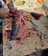 Cutting fish on the table. Fish market. A man cleans the entrails and cuts a catfish into pieces. Day. Autumn. Egypt.