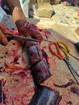 Cutting fish on the table. Fish market. A man cleans the entrails and cuts a catfish into pieces. Day. Autumn. Egypt.