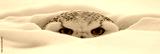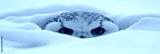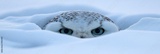 A snowy owl partially concealed in snow, showcasing its striking eyes.