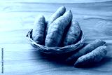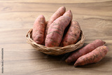 Raw organic Japanese sweet potatoes in basket on wooden background