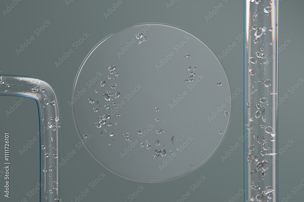 Transparent 3D circle with bubbles, on a gray background with a place for text. The concept of cosmetics, medicine, science.