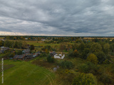 Top view of the village, landscape and houses, forest and fields from the height of a flying drone.