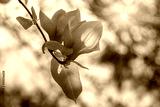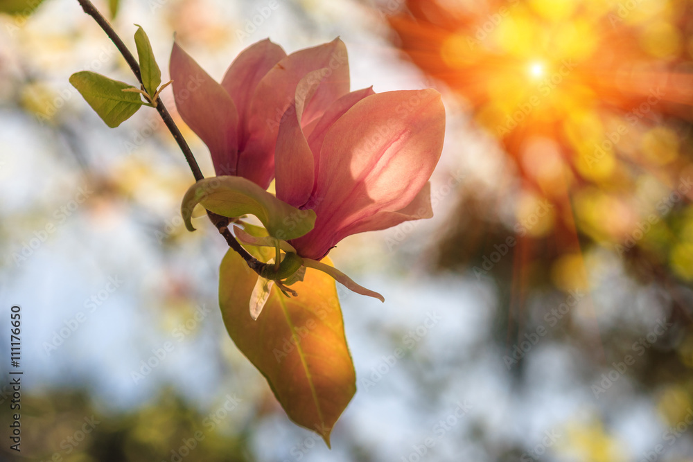 Beautiful pink Magnolia flower blooming in springtime in sunlight.