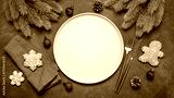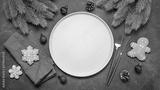 Christmas minimal table setting, empty beige plate, cutlery, gingerbread cookies and christmas decorations, top view, flat lay.