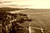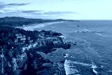 Scenic Oregon Coastline at Sunset: Dramatic Cliffs, Serene Shoreline, and Pacific Ocean Waves with Coastal Trees and Blue Evening Sky