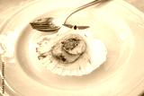 Delicious Mediterranean dish with Saint Jacques mussels, served on a platter in a small restaurant on the main promenade of Piran, Slovenia