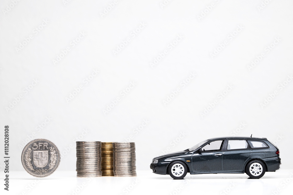 Small metal toy model car next to a stack of coins and a 5 Swiss Francs coin isolated on white. Close up shot, side profile, dark gray station wagon, no people