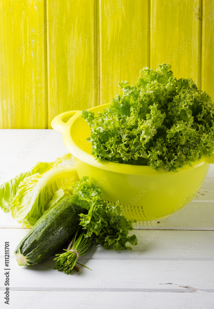 Fresh lettuce in green sieve